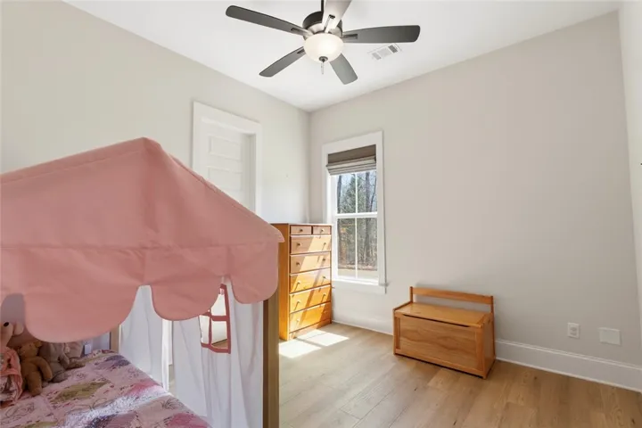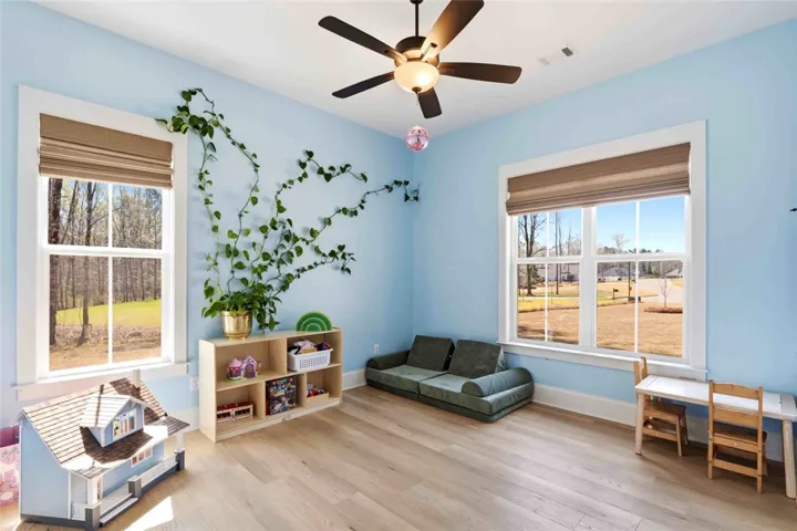 The open-concept layout is enhanced by hardwood flooring throughout—no carpet—offering a clean, cohesive look and easy maintenance. The attention to detail continues into the dining room and primary bedroom, both featuring beautiful wood beam accents that elevate the overall design.