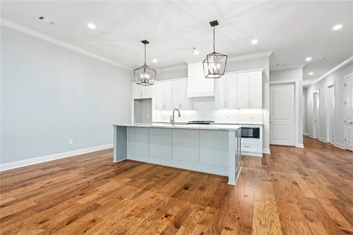 Inside, the home features a bright, open-concept layout ideal for both everyday living and entertaining. The kitchen serves as the heart of the home with stainless steel appliances, marble countertops, and a classic tile backsplash, creating a stylish and functional space for gathering. The living room is anchored by double built-ins surrounding the fireplace, adding warmth, character, and practical storage.