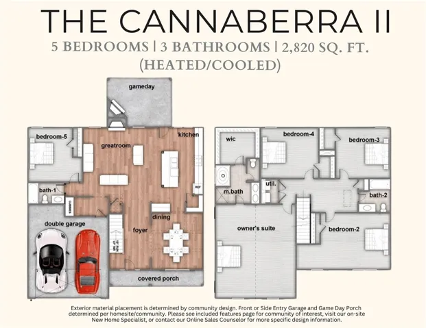 Welcome to Drakes Landing, one of Opelika’s most desirable communities, where refined comfort and thoughtful designs come together in an inviting, modern setting. Step into the Cannaberra II B Floorplan, boasting 2,907 SF of versatile living space with 5 Bedrooms & 3 Full Baths, designed to accommodate today’s lifestyle with effortless elegance. An inviting foyer leads into a formal dining room highlighted by a beautiful, coffered ceiling and trim details that elevate the space. The expansive great room is warm and welcoming, centered around a charming wood-burning fireplace, perfect for gatherings and relaxed evenings. The open-concept kitchen impresses with upgraded cabinetry, granite countertops, tiled backsplash, recessed lighting, and stainless-steel appliances. The large center island with integrated sink and dishwasher offers ideal functionality for cooking, serving, and entertaining, all overlooking the great room and breakfast area. A walk-in pantry adds valuable storage. The main level includes a full bath and the 5th bedroom, perfect for guests or a private office. The Owner’s Entry features our Signature Drop Zone with built-in cubbies, an everyday luxury that truly keeps life organized. Upstairs, the owner’s suite invites relaxation with abundant light and a vaulted ceiling. The spa enchanted bath features a garden tub, separate tiled shower, dual vanities with quartz countertops, and a spacious walk-in closet. Three additional bedrooms offer comfortable living with convenient access to the hall bath, linen storage, and nearby laundry. Enjoy luxury flooring in main living areas, a two-car garage, and our Signature Gameday Patio, complete with a wood-burning fireplace, outdoor speakers, and ceiling fan, an outdoor entertaining space you’ll love year-round. With a community pool, playground, and clubhouse, Drakes Landing offers the perfect balance of upscale comfort and an active, connected lifestyle.