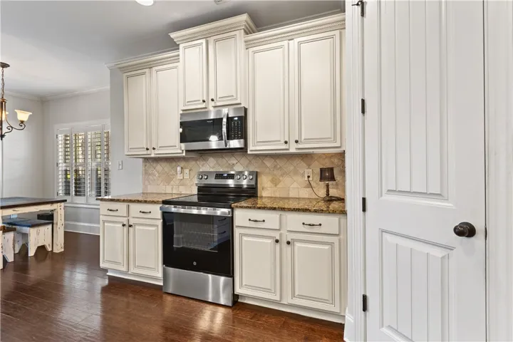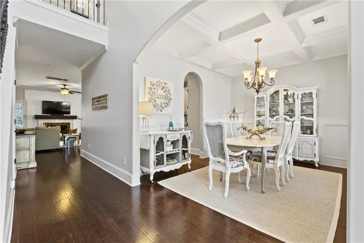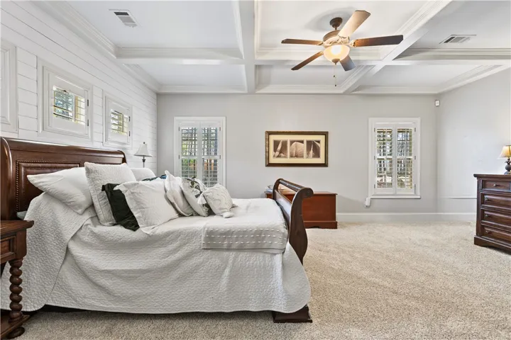 Beautiful 5BR/3.5BA home with a desirable floor plan and brand new carpet. The spacious primary suite is located on the main level and features double closets and dual vanities. Beautiful molding and coffered ceilings in the dining room and primary bedroom add elegant detail. Kitchen has granite and stainless appliances and overlooks the living space.