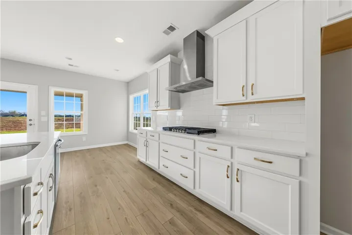 The kitchen is designed to impress with quartz countertops, stylish cabinetry, a tiled backsplash, stainless steel appliances, a gas cooktop, a wall oven/microwave combo, a stainless steel vent hood, and a large island with an integrated sink and a luxury dishwasher. A bright breakfast area and walk-in pantry complete this functional and beautiful space.