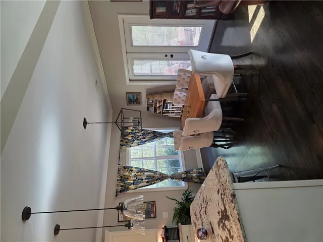 The dining area features a charming window and opens to a screened-in patio, perfect for enjoying peaceful evenings overlooking a private backyard with mature landscaping.