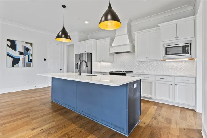 Step through the foyer into an open-concept layout featuring 10’ ceilings and stunning 8’ interior/sliding doors. The chef-inspired kitchen shines with a large island, herringbone subway tiles, and customized pendants—perfect for entertaining.