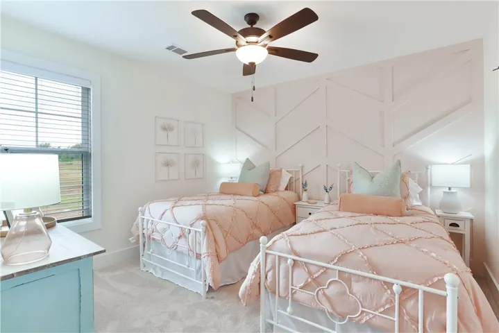 The Trent C is a three bedroom, two and a half bathroom home that spans across 1,684 square feet and features a two car garage. As you enter into the home, you enter into the foyer that has access to the garage and powder bathroom. The foyer flows into the open concept kitchen, dining and living area with 9′ ceilings throughout main level. The kitchen features a large center island and TWO pantry spaces, one being a large walk in! The main level of the home has large windows that allow for natural light to brighten the space. As you make your way upstairs, you’re greeted by the primary suite that features an en-suite bathroom with large vanity space and double sink option, a walk-in shower, and a HUGE walk-in closet. On the opposite side of the hallway, you will find two guest bedrooms that share a full bathroom located at the end of hallway! The laundry room is centrally located between all of the bedrooms. A pull down attic access in the hallway shows the Spray Foam Insulation in your attic space helping to keep your home comfortable & your systems running efficiently all year long!