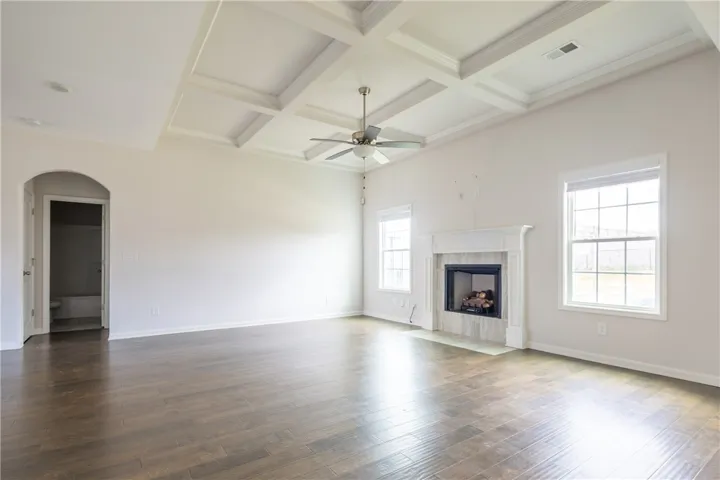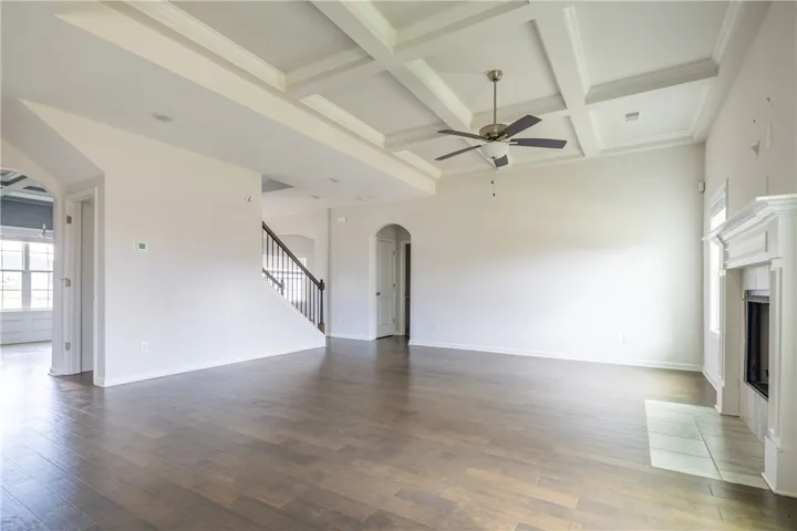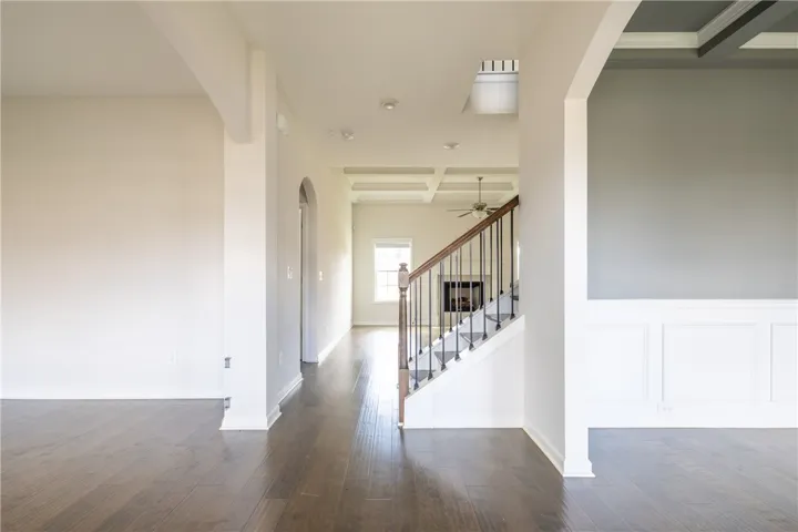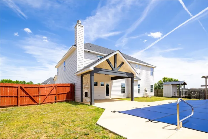 This thoughtfully designed 5-bedroom, 3-bath home with in-ground pool offers the perfect combination of comfort and functionality. A formal dining room, media room, and dedicated office provide flexibility for both everyday living and entertaining. The heart of the home features an open-concept layout with engineered hardwood flooring, a coffered ceiling, and a well-appointed kitchen complete with granite countertops and a gas range. Step outside to a covered porch with fireplace overlooking the in-ground pool, creating an ideal setting for