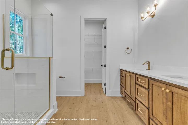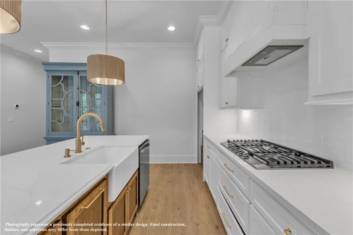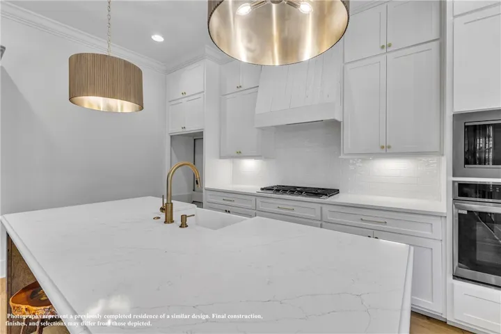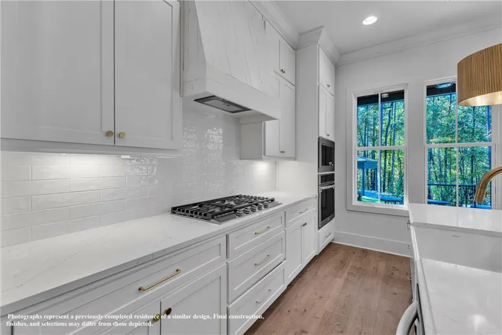 The exterior boasts Hardie siding in Urbane Bronze, bronze windows, and covered front and rear porches. Inside, find 10-foot ceilings, LVP flooring throughout, and a cozy gas fireplace. There is also a dedicated laundry room and an upgraded kitchen that includes a gas cooktop, built-in microwave/oven combo, farm sink, dishwasher, disposal, and modern hardware accents.