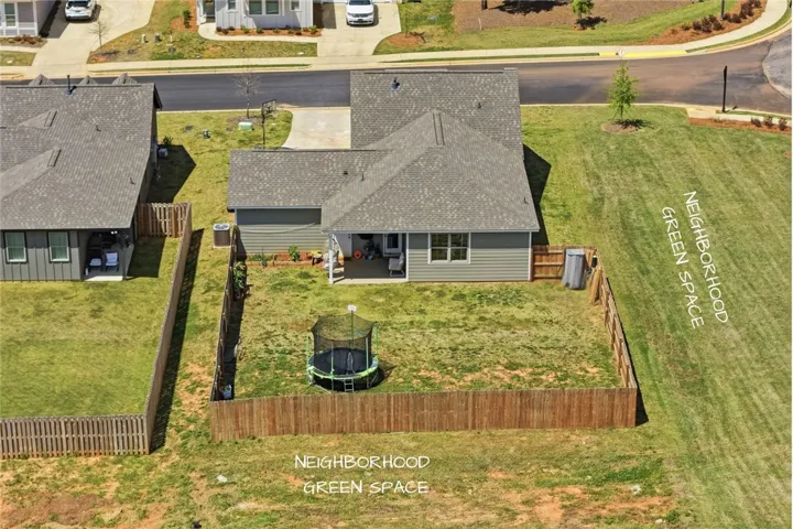 Bordered by an expanse of neighborhood green space, this homesite offers a rare sense of openness and privacy. A stretch of beautifully maintained lawn to the left—perfect for a game of catch or simply enjoying the outdoors—coupled with additional protected area behind the lot, create a comfortable buffer from neighboring homes. It’s a unique setting within Woodward Oaks. All on one level, the home offers an easy, functional layout suited for a variety of lifestyles. The foyer opens to a vaulted living room anchored by a punchy accent wall with custom millwork. Just beyond, the kitchen features quartz countertops, a complementary backsplash, an island with seating, a pantry, and a centrally located breakfast area. The primary suite overlooks the backyard and includes a well-appointed bath with a step-in shower, dual-sink vanity, and a walk-in closet. A flexible space—ideal for a study, playroom, or fourth bedroom—is accessed through French doors off the main living area and connects conveniently to the secondary bedroom wing. This wing includes two bedrooms, each with generous closet space, and a shared hall bath. The laundry/mudroom opens directly to a spacious covered porch and fenced backyard. A two-car garage, a rare find in this phase of Woodward Oaks, further sets this home apart.